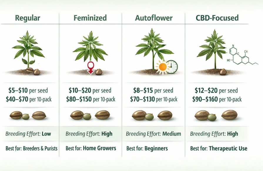 Seeds bred for high cannabinoid levels or heavy yields require strict selection and testing. Those performance traits often raise the price.